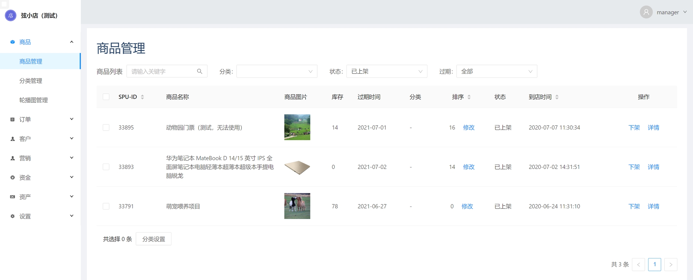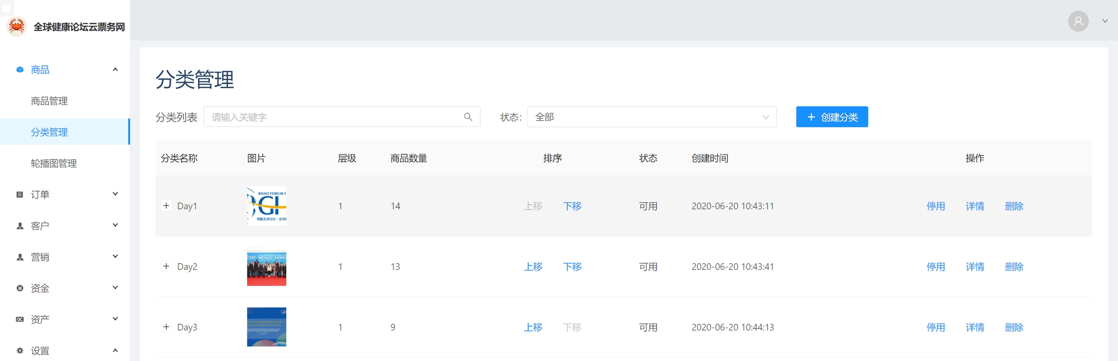 前往商品-分类管理页面,点击创建分类按钮,即可添加新的分类,在已有的分类中点击详情按钮,可对其进行编辑。
