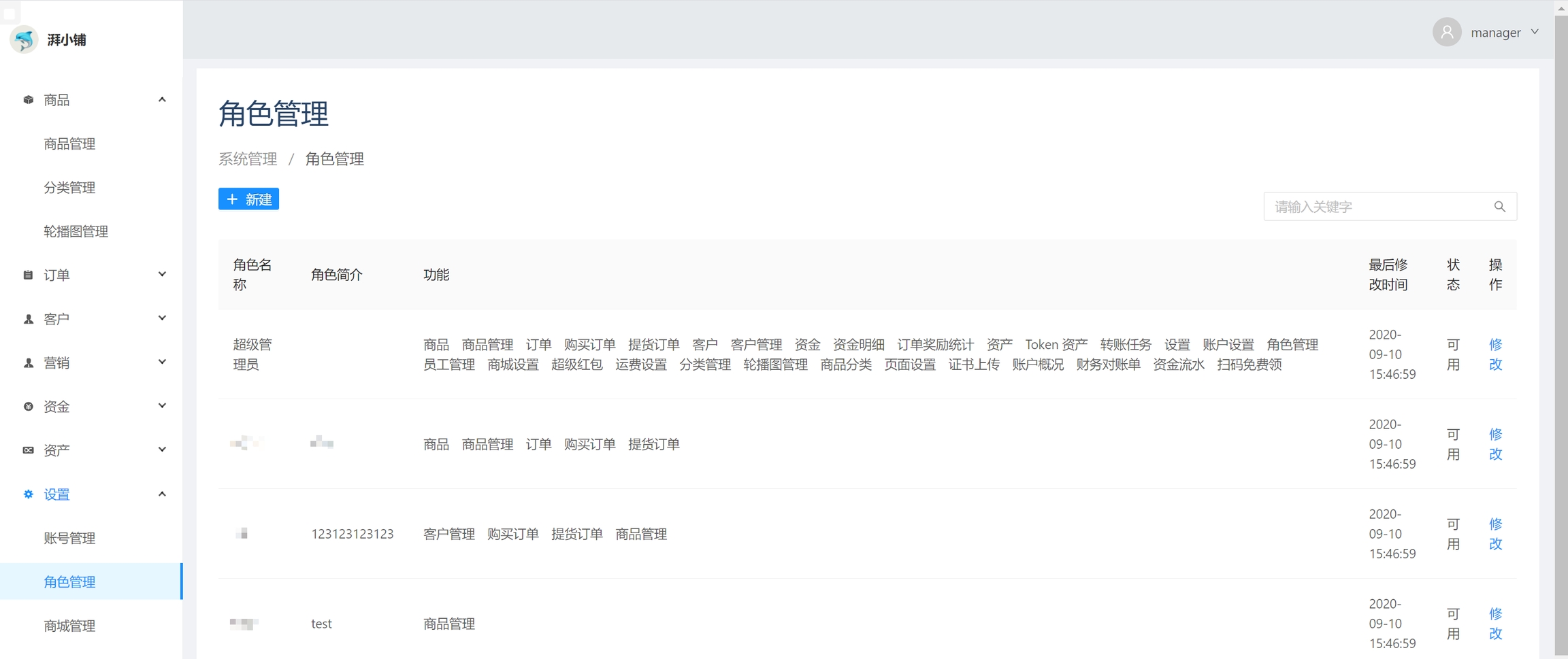 小明家店铺有专门的商品管理人员A,主要处理各种商品的上下架和库存的调整,小明希望A员工只能操控这部分模块,此时通过创建一个拥有此类权限的新角色赋予给A的账户,即可满足该场景。