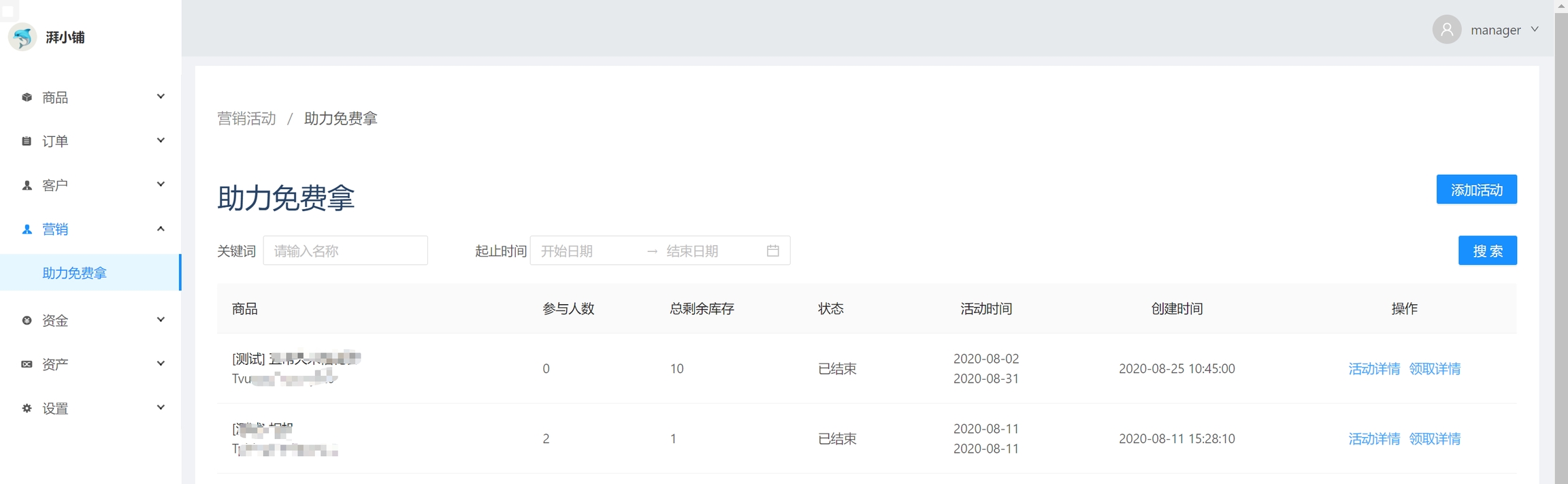 前往营销-助力免费拿页面,点击右上角添加活动按钮,添加免费领取的商品,确定活动库存和助力人数,填写活动规则和活动时间,即可创建完成。创建完成后点击推广按钮,即可开始推广活动。